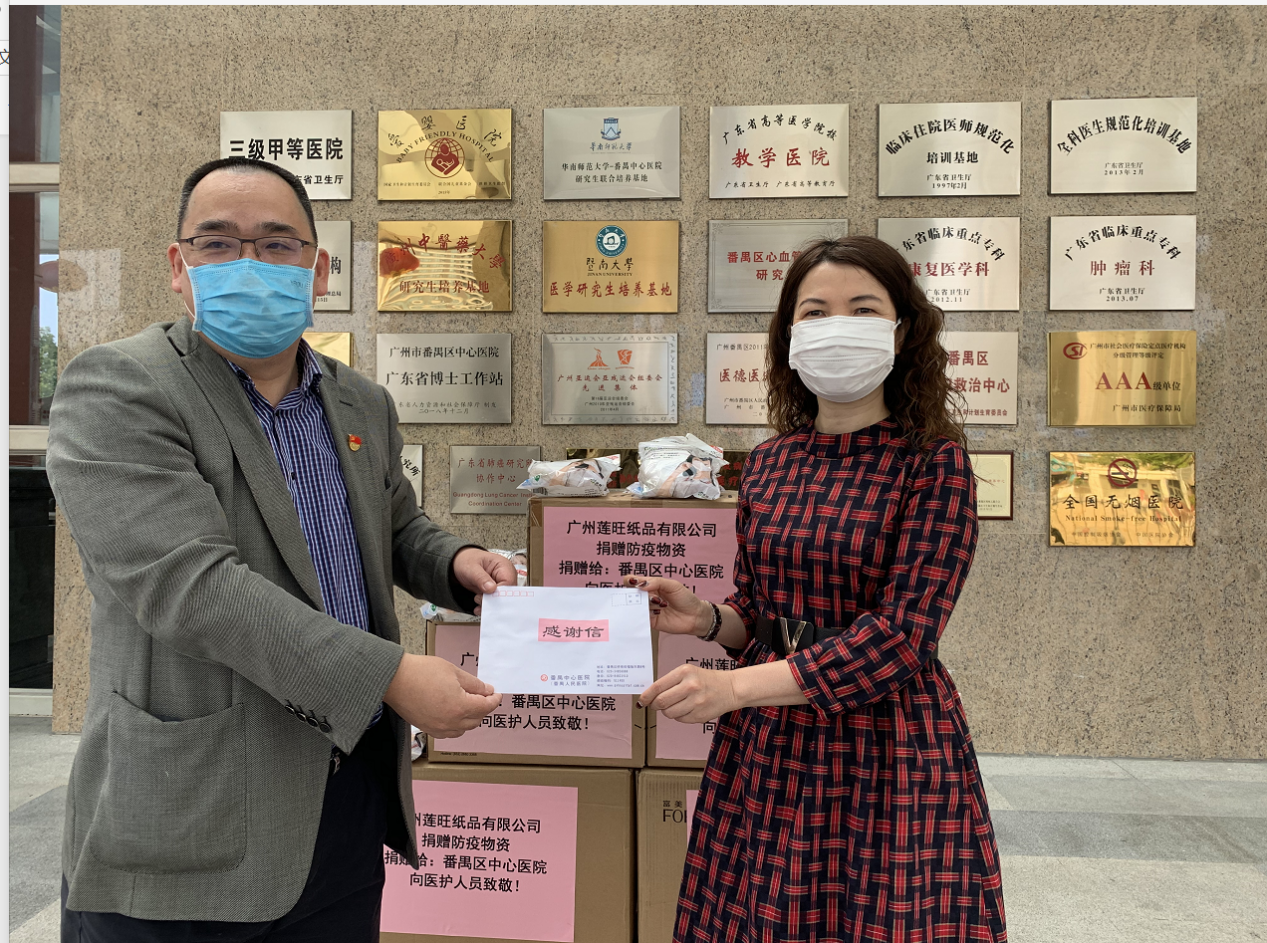 (黎艳芬代表(右)向番禺区中心医院捐献物资)